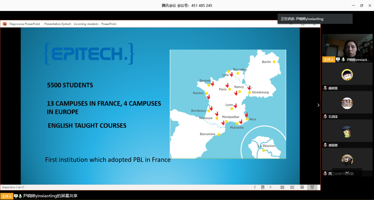 、计算机学院等学院的部分学生参加了本次线上宣讲会。尹老师在法国从事计算机软件专业的国际教育合作多年,曾就职于中国驻外使馆经济商务处,并获得法国MBA工商管理硕士,对PBL (Project-based Learning) 教育模式与教学创新有深刻的认知,具有丰富的国际教育合作经验。