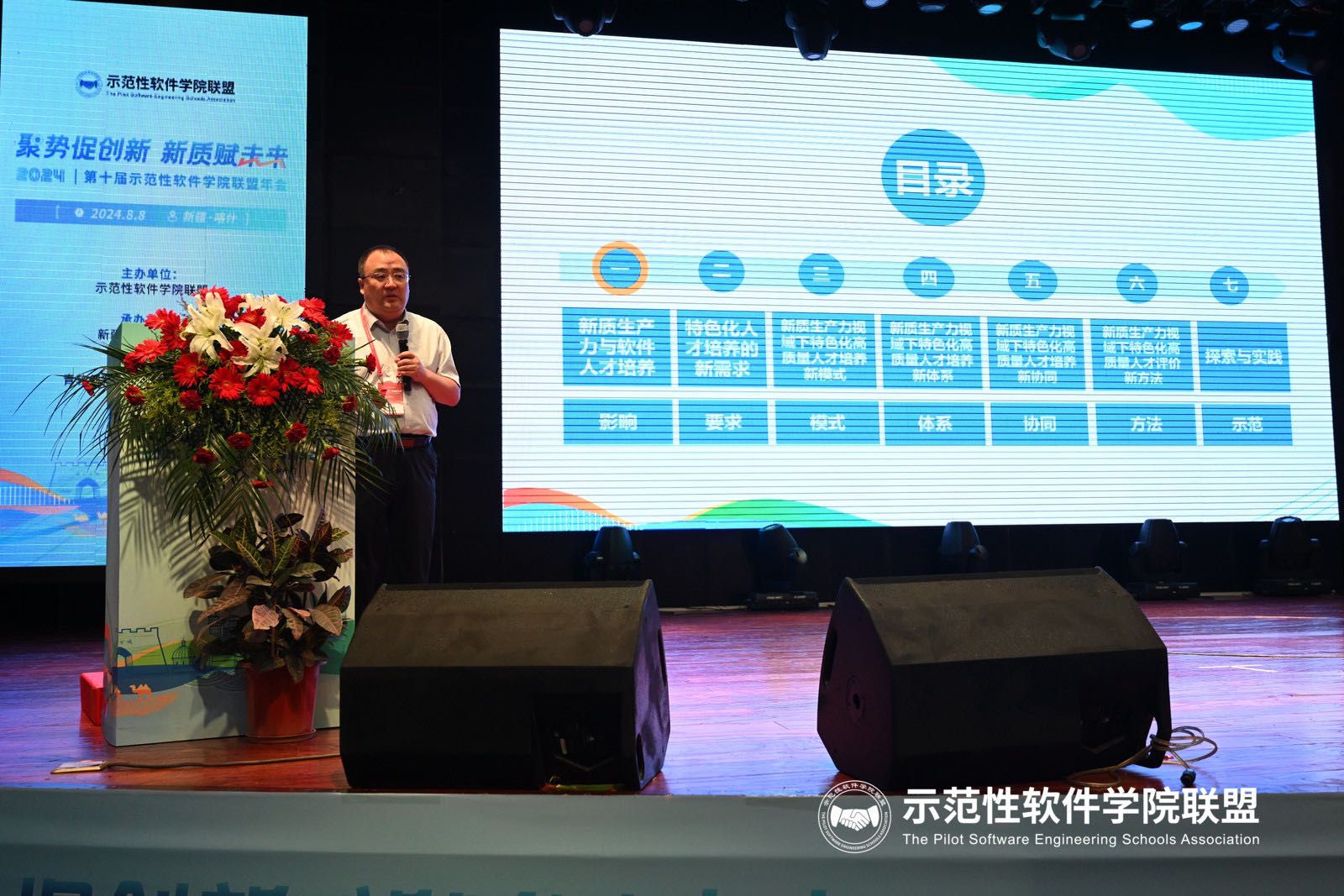郑江滨受邀在大会发表主题演讲,围绕新质生产力视域下的软件人才培养的新模式、新体系、新协同及人才培养新方法等多个维度,分享了学院近年来推动软件教育持续优化与提升的经验与前瞻思考。他指出新质生产力的形成是由技术革命性突破、生产要素创新性配置以及产业深度转型升催生的结果,具有高科技、高效能、高质量的特征,软件人才培养与新质生产力是相互适应、促进与共同进化的,在新质生产力的驱动下,软件人才培养逐渐向新工科、大交叉、复合型、高质量的需求转变。学院通过系统规划学业、校企联合培养、“总师育人文化”融于课程建设、“免费看a片