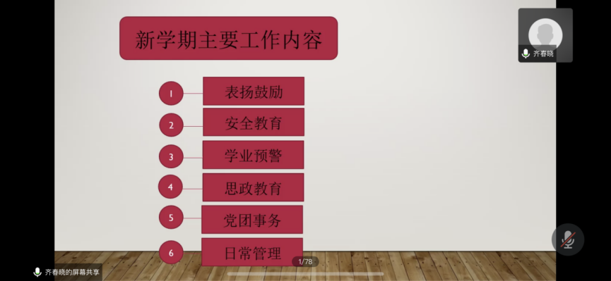 本次会议分为两项内容:首先由许军毅老师对上学期工作做出总结,并介绍新任分管辅导员老师—齐春晓;其次由齐春晓老师对新学期工作做出相关部署。