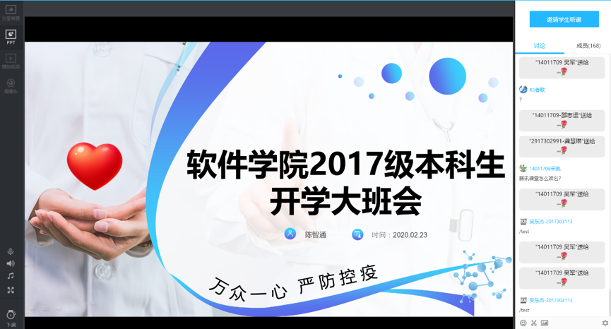 为了响应国家的“停课不停学”的号召,同学们从明天24日起就要在QQ、腾讯课堂、雨课堂等平台进行线上学习。陈智通老师严明了纪律,强调严格按照学校作息时间,提醒同学们做到不旷课、不迟到、不早退、不找人代课、不替人代课、上课时间不做与课堂无关的事;提前准备上课所需的软件、插件,熟悉上课平台的操作,有问题及时通过相关渠道反馈;坚持每日报告健康状况,配合学校做好统计工作;保持健康心态,落实居家学习。同时,陈智通老师也对前段时间同学们关注比较多的问题,如通过什么途径能联系上授课教师、没有教材怎么办、上学期不及格的课程什么时候补考等等,一一做了解答,再次重申3月2日之前不得返校,希望大家等候耐心等候具体返校通知。