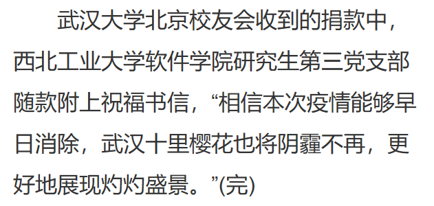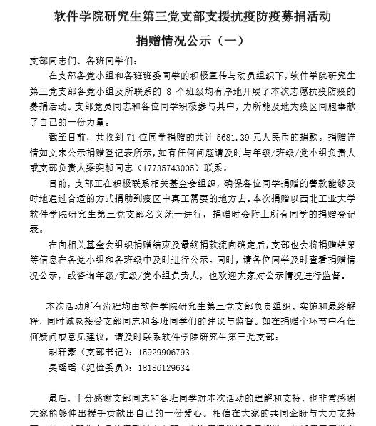 研究生第三党支部将同学们的爱心送到前线真正需要的医护人员手中去。整个过程中,支部将募捐及捐赠情况进行两次及时公示,确保募捐活动各流程透明公开。最后,武汉大学北京校友会向支部同学们表达了感谢,相关内容也被中国新闻网、武汉大学北京校友会等媒体网站上进行报道。