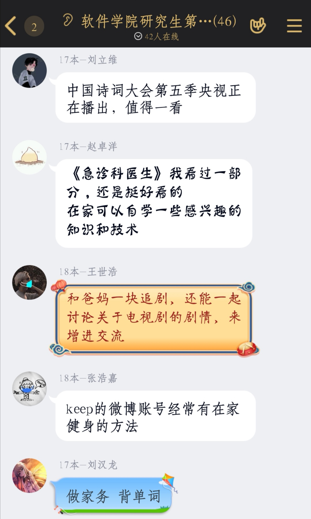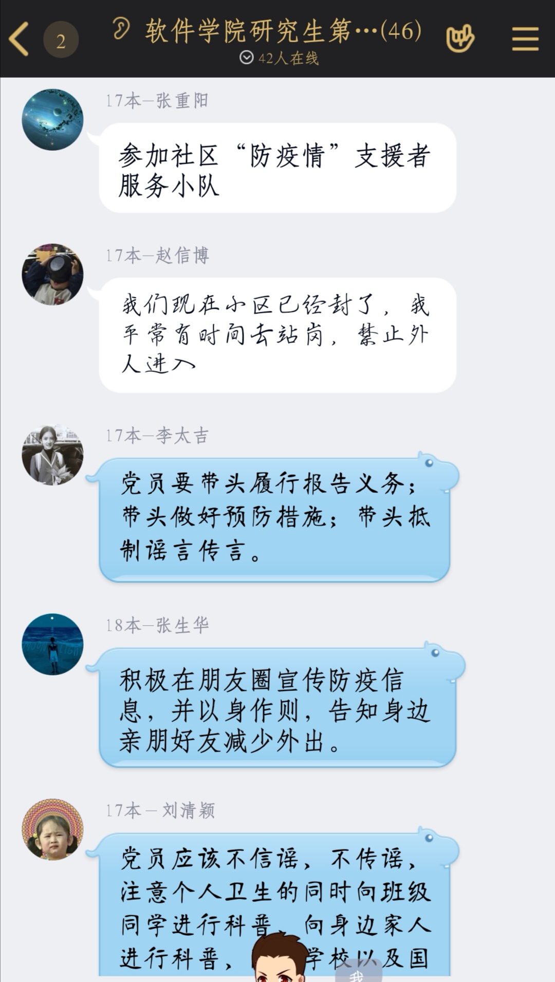 除此之外,支部党员结合自身实际,力所能及地为支援防疫贡献自己的力量。张重阳、王世浩、秦鹏等同志响应号召,参加居委会、村委会组织的相关防疫志愿者活动,他们戴上口罩,拿起工具,参与车辆排查、巡逻值班、义务宣传、清扫消毒、意见收集等工作,以实际行动展现了新时代学生党员的风采,为广大同学们树立了榜样。研究生党员梁奕桢同志,利用自己的专业优势,通过直播平台向低年级学分享自己的考研经验,义务讲解研究生报考相关事项和要点,赢得了低年级同学们的赞扬和感谢。