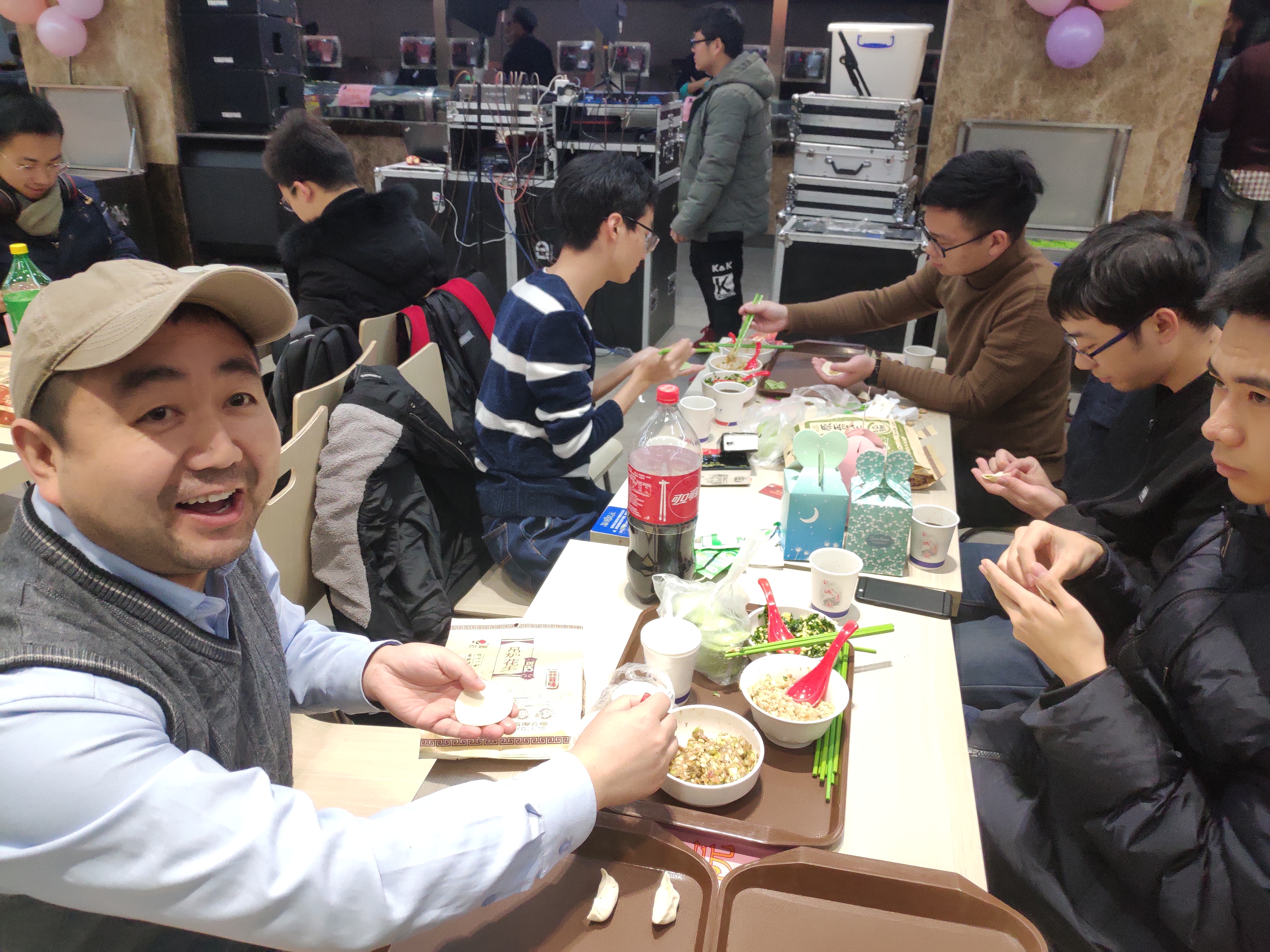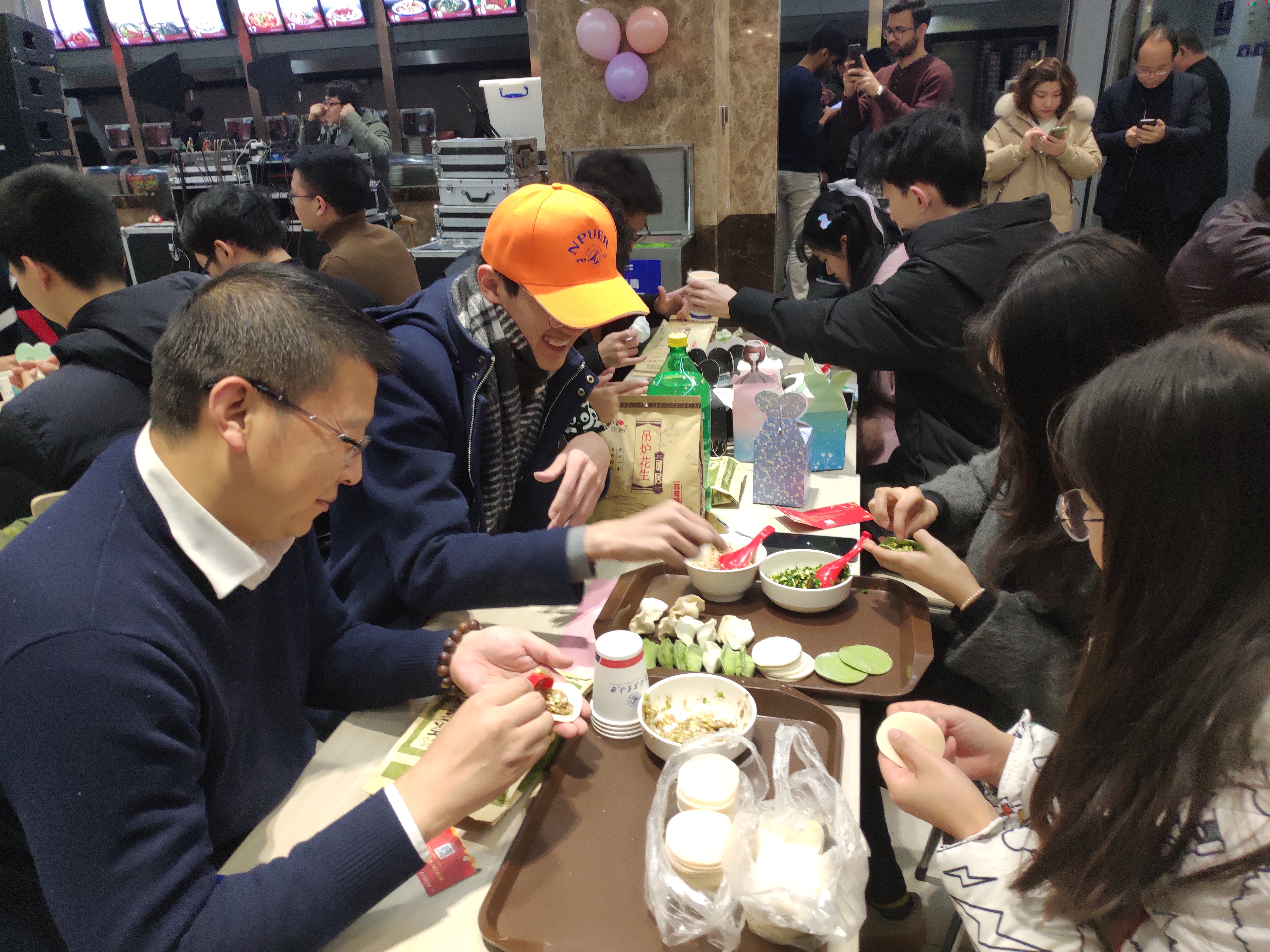 下午四点左右的学生第一餐厅已是人山人海,人满为患。学生们在安全员的引导下早早地进入餐厅,感受新年氛围,着手包饺子。随后张艳宁、陈洪亮、郑江滨、王犇、黎昞、齐春晓老师先后加入包饺子队伍。在这拥挤的食堂中,来自不同学院,不同民族乃至不同国家的老师和同学们各自展现着其包饺子的工艺, 此时此刻,老师与同学们之间的距离再次拉近,欢声笑语,在热闹的气氛中感受着节日带来的快乐。