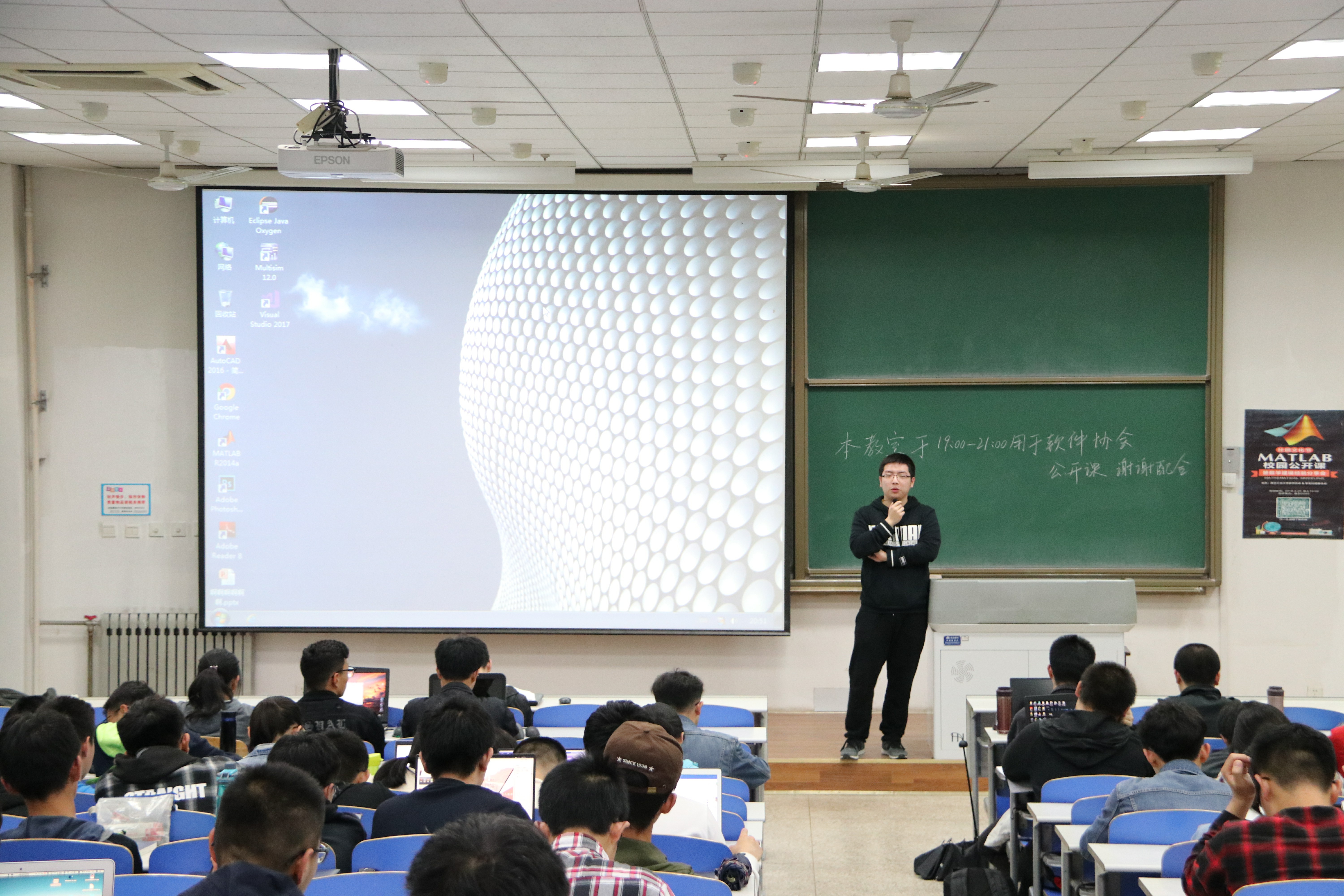 五一数模节,提升学生参与比赛积极性,2019年4月20日,软件协会与学生社团联合会于教学东楼D座205举办的MATLAB校园公开课。本次课程的三位主讲人分别为:软件协会组织部部长田皓哲、数模协会会长李永奇及获得全国大学生数学建模竞赛一等奖的黄雅莹同学。在前期各个宣传工作的铺垫下,本次公开课实际参与人数超出预期人数。