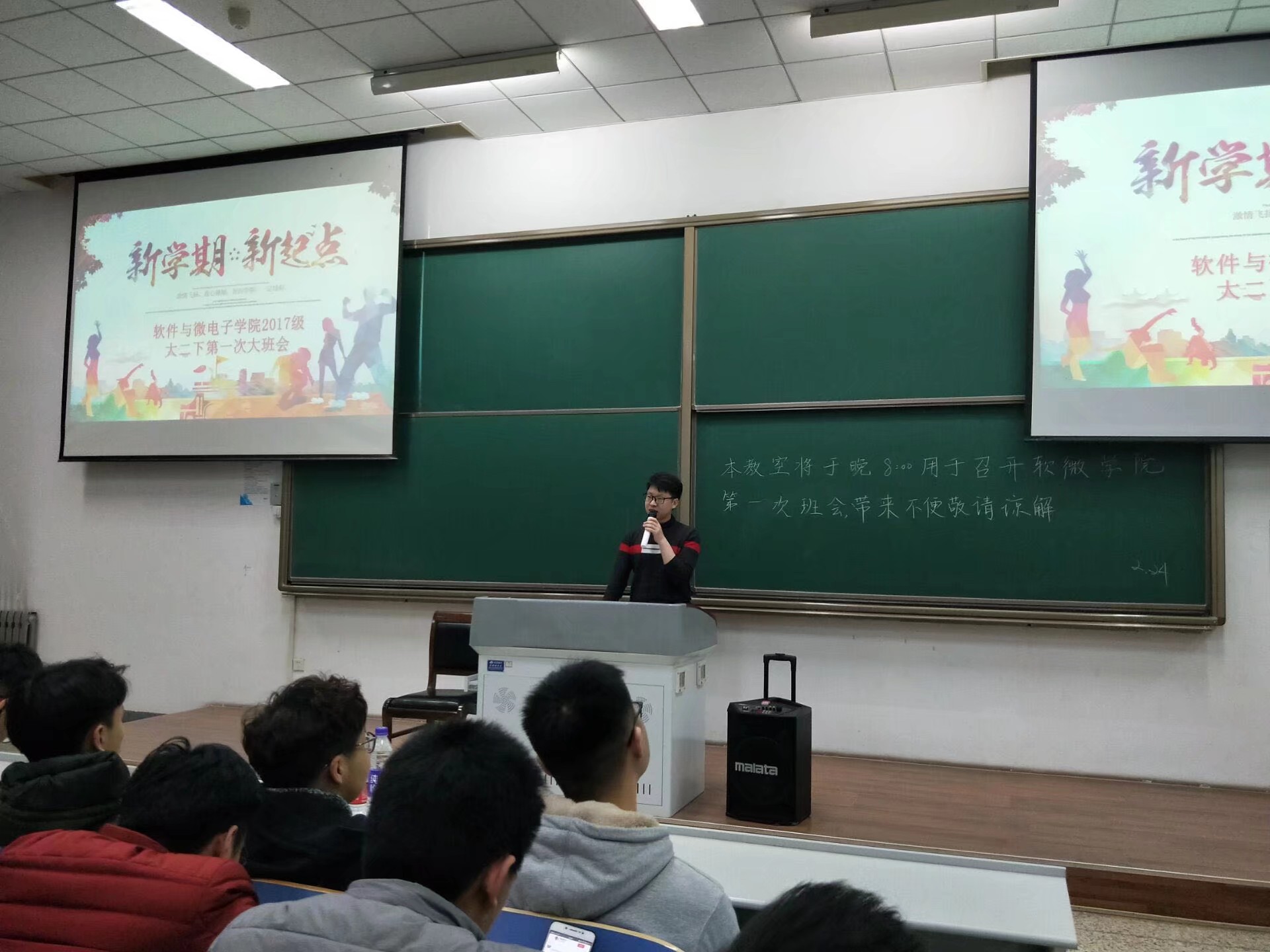 新春伊始,万象更新。经过了一月有余的寒假,踏着春的脚步,我们又回到了美丽的校园,准备开启一个崭新的学期。2019年2月24日晚20:00,软件与微电子学院2017级本科生新学期第一次大班会于教学西楼D102正式召开,本次大班会有2017级辅导员陈智通老师主持,大会以“独梦寒窗倚栏处,正是风起云涌时”为主题,全体同学积极参加。
