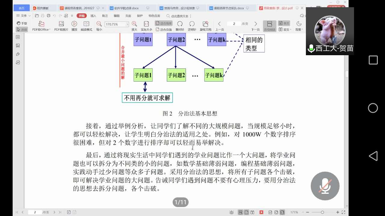 在指导过程中,贺老师指出,将课程思政元素融入教学大纲,实现知识传授和价值塑造的统一,就像盐化于水,是一个润物细无声的过程。罗建超老师的课程思政案例的设计给学生提供了学习助手,即学习方法指导。例如在遇到复杂问题时,利用分治法将大难题分解为不同类的小问题,各个击破,最终使问题得到解决。贺老师分析课程案例中认为,每个教师在课程思政案例的设计中都有自己的特色。例如,徐韬老师设计的课程思政案例就非常独具个人特色,利用《小徐讲堂》这一具有个人特点的方式,让学生了解IT发展历程,树立正确价值观、奋斗观。