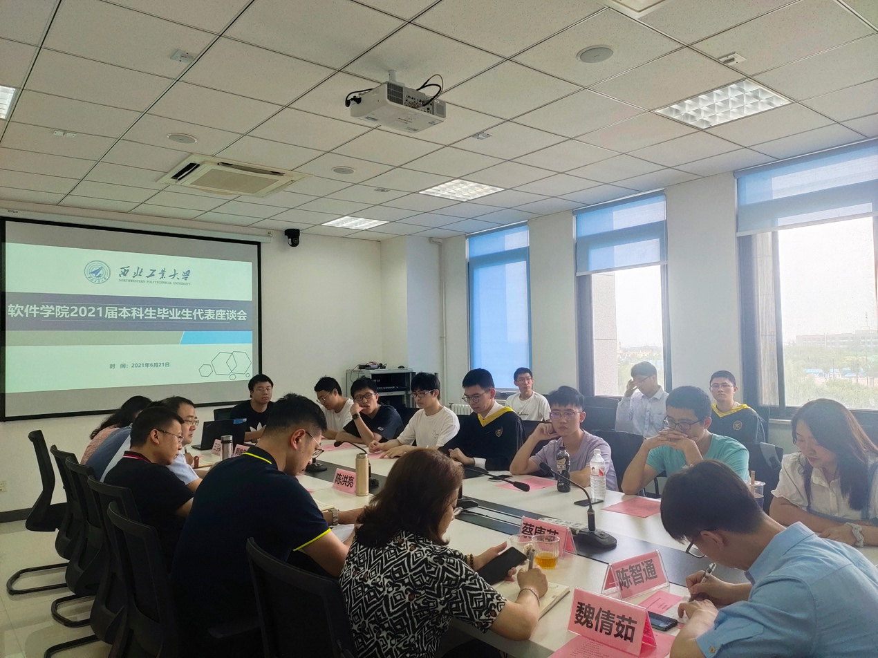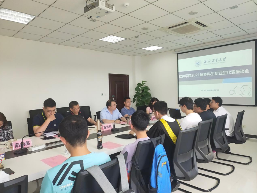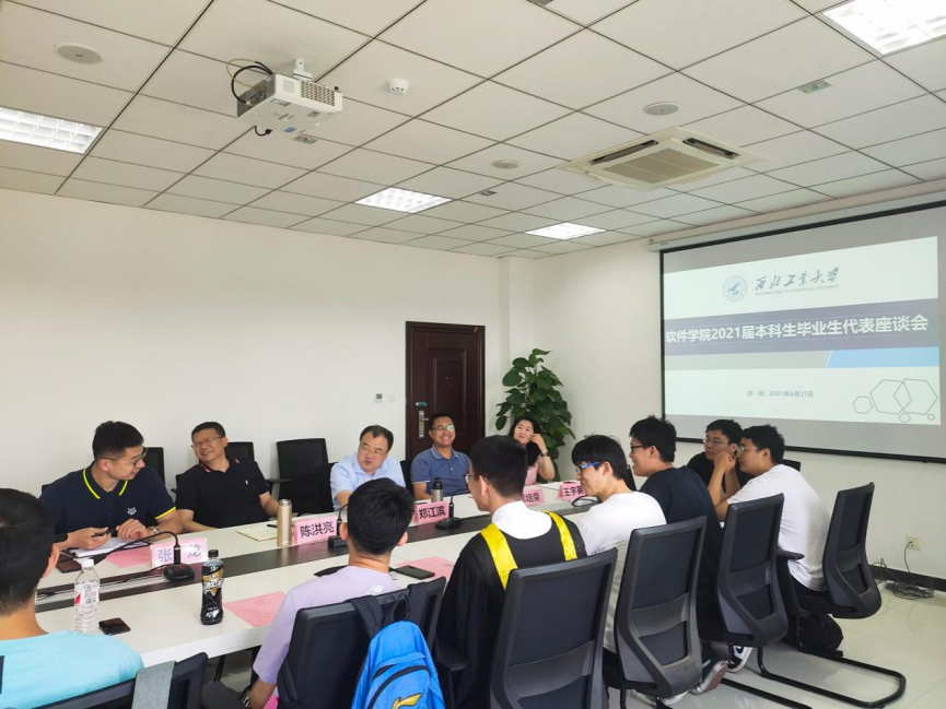 2021年6月21日上午11:00,免费看a片 2021届本科毕业生代表座谈会在长安校区启翔楼303会议室进行。免费看a片 党委书记陈洪亮、院长郑江滨、副院长郭培荣、党委副书记张龙、办公室主任王宇英、本科生教学秘书蔡康英、院长助理兼2017级本科生班主任魏倩茹、2017级本科生辅导员陈智通及十余名本科毕业生代表们共同参加,会议由张龙主持。