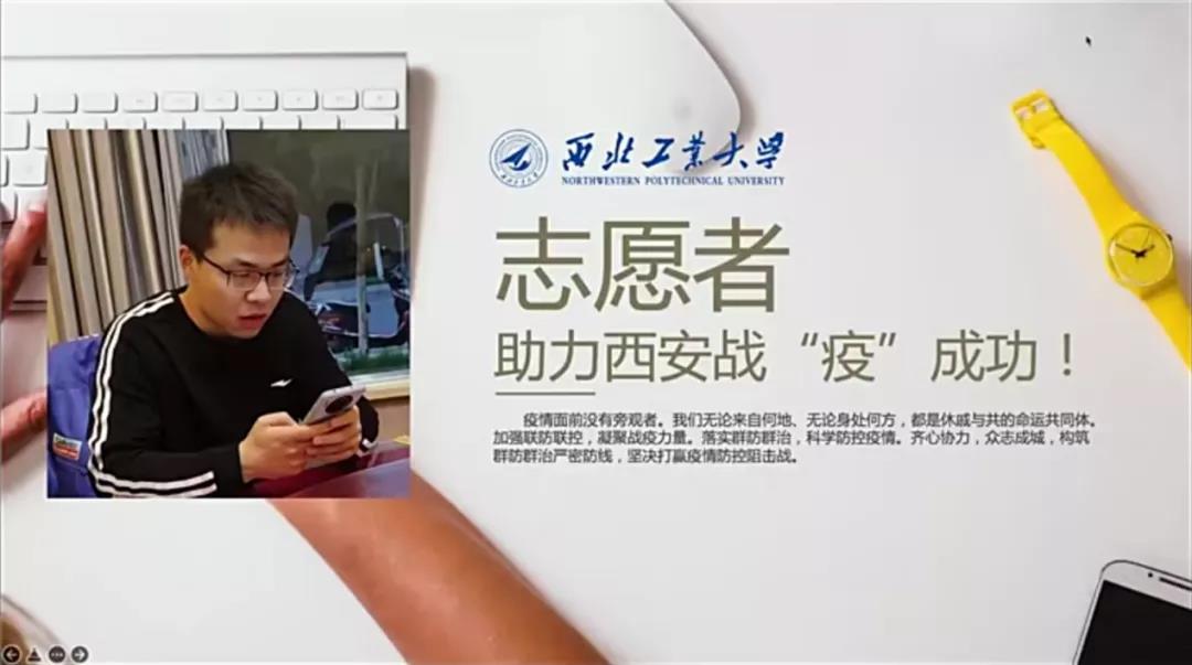 晚会同时连线了坚守岗位的武恩州同学,他向我们实地展示了配餐志愿者们卸餐、运餐、清点和送餐的全过程,井然有序,有条不紊。他与现场共同配餐的两名20级本科生志愿者表示,虽然配餐工作会有一些身体上的疲劳,但是看到同学们能够在封宿期间吃上一口热饭,再苦再累心里也是高兴的,最后他们为西安的战疫加油鼓劲:西安,加油!长安,常安!