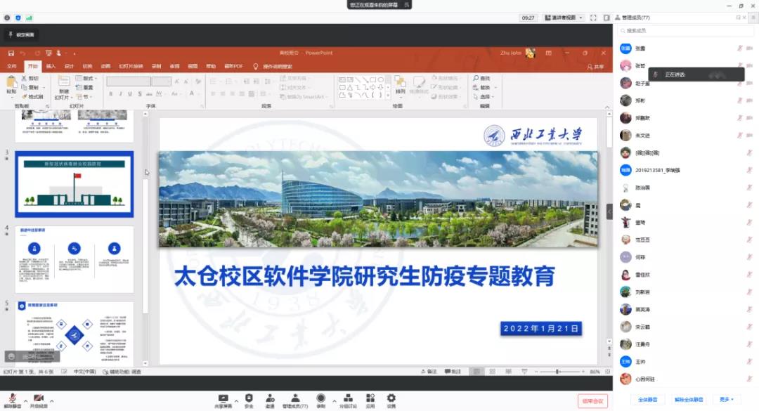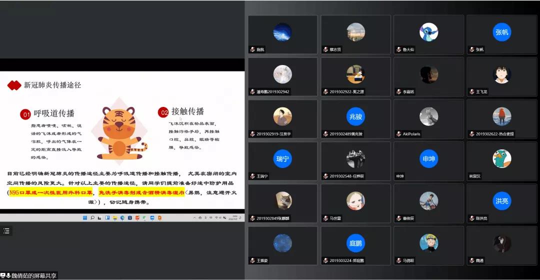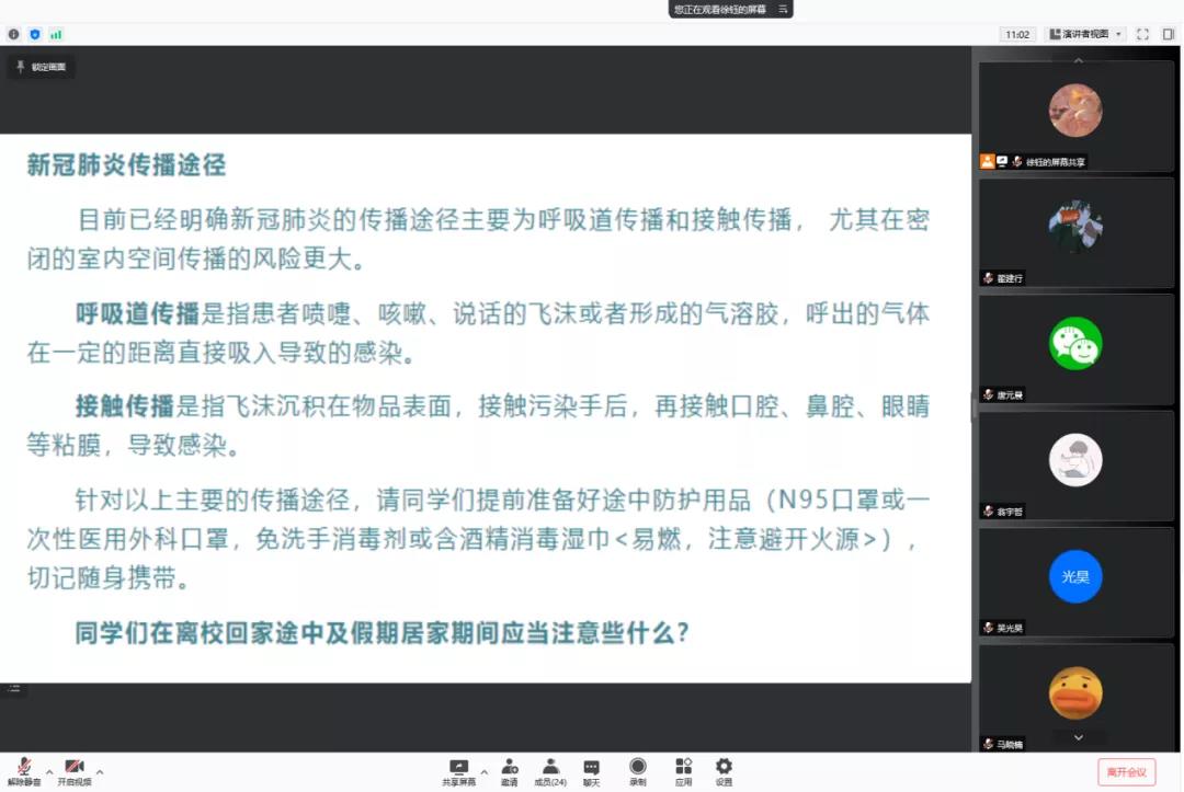 郭培荣副院长在班会中,针对学生寒假的留校离校注意事项作以讲解,提醒学生离校前一定要咨询好家乡所在地的防疫政策,提前收拾好自己的行李,不要遗漏自己的重要证件。此外他还为同学们讲解了新冠肺炎的传播途径,并在此基础上提醒同学们在返乡途中该怎样做好防护工作,提醒同学到家之后一定第一时间给班主任报平安。同学们认真听讲,有问题及时开麦提问,将注意事项牢记于心。