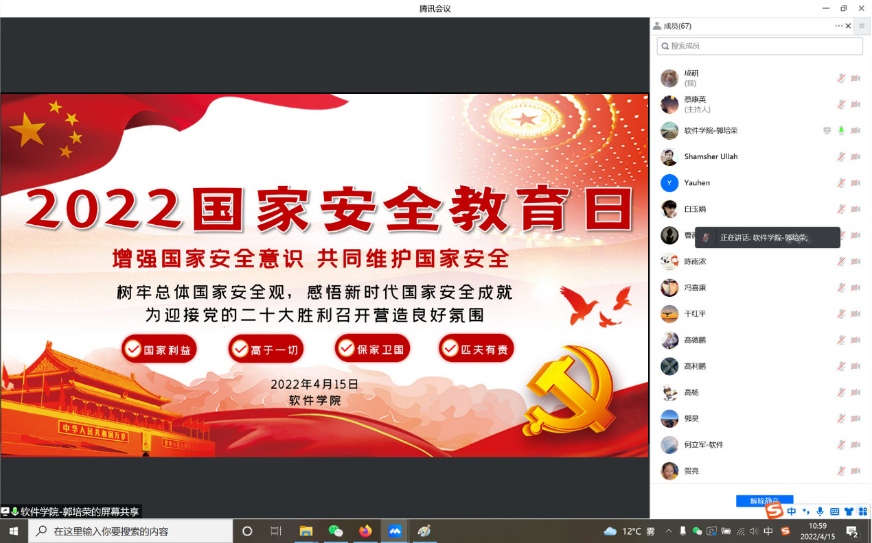 在宣讲培训会上,郭培荣副院长传达了学校关于开展“全民国家安全教育日”宣传教育活动的相关要求和安排,就学院开展相关活动进行了动员和说明,并对保密安全工作进行了重点宣讲和培训。围绕增强保密意识和做好保密管理制度化、规范化建设,郭培荣副院长对学院涉密设备、涉密载体、联网设备、微信工作群等的使用管理进行了要求和强调。会后,学院组织全体教职工在线参观了《台儿庄国家安全教育馆》,观看了《2022国家安全宣传片》和《国家安全保密宣传教育视频》,动员教职工参加了“中国普法微信公众号”上的国家安全教育日有奖知识竞答活动。
