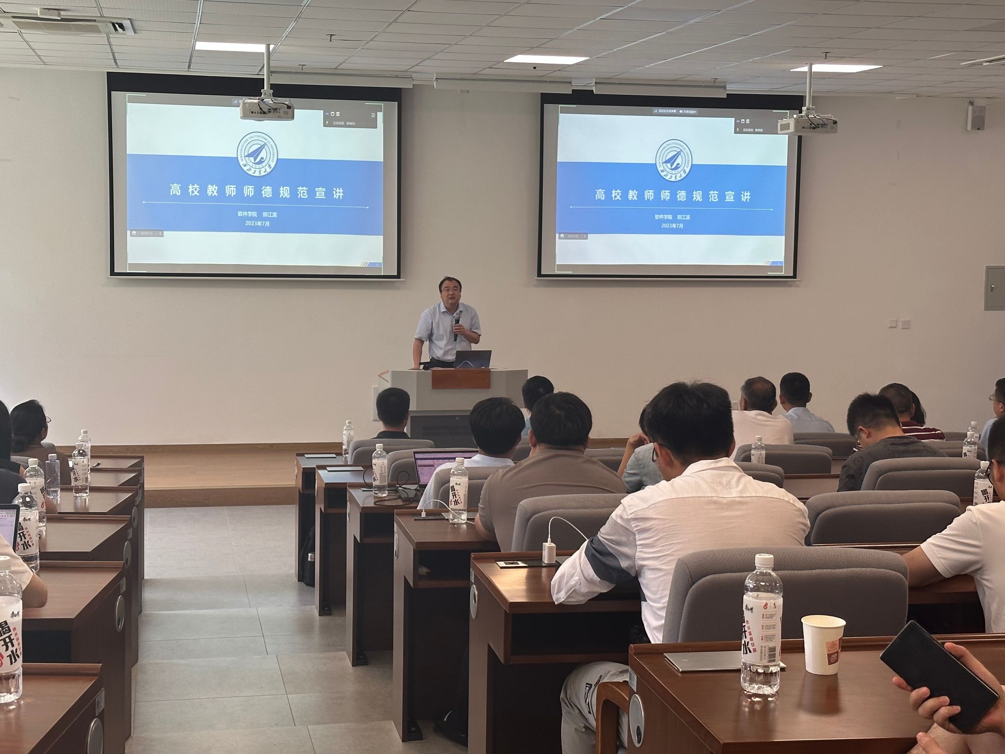 会议第二项,学院院长郑江滨作《高校教师师德规范宣讲》,带领全体教职工学习了习近平总书记关于教师队伍建设的重要指示批示精神和国家关于高校教师师德规范相关文件要求,对《新时代高校教师职业行为十项准则》《研究生导师指导行为准则》《关于高校教师师德失范行为处理的指导意见》《免费看a片