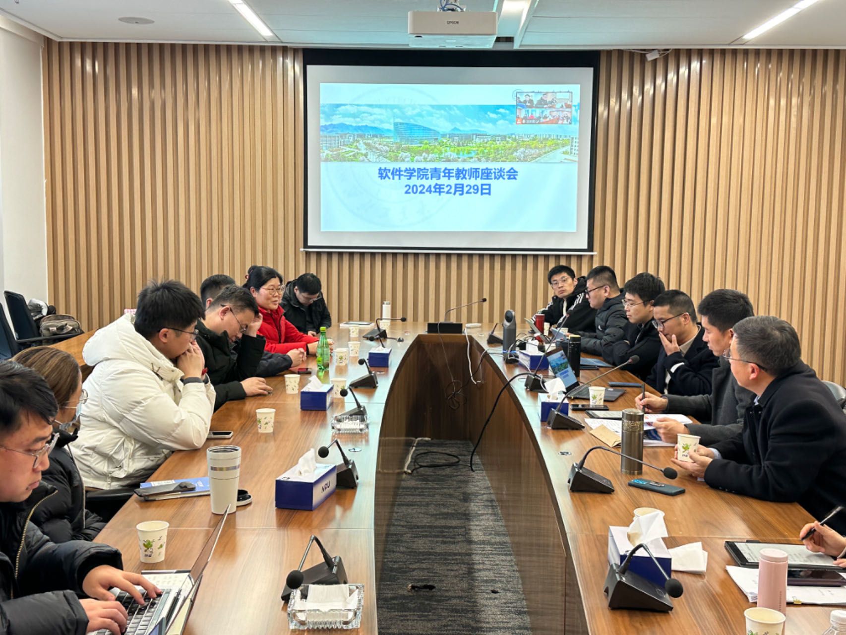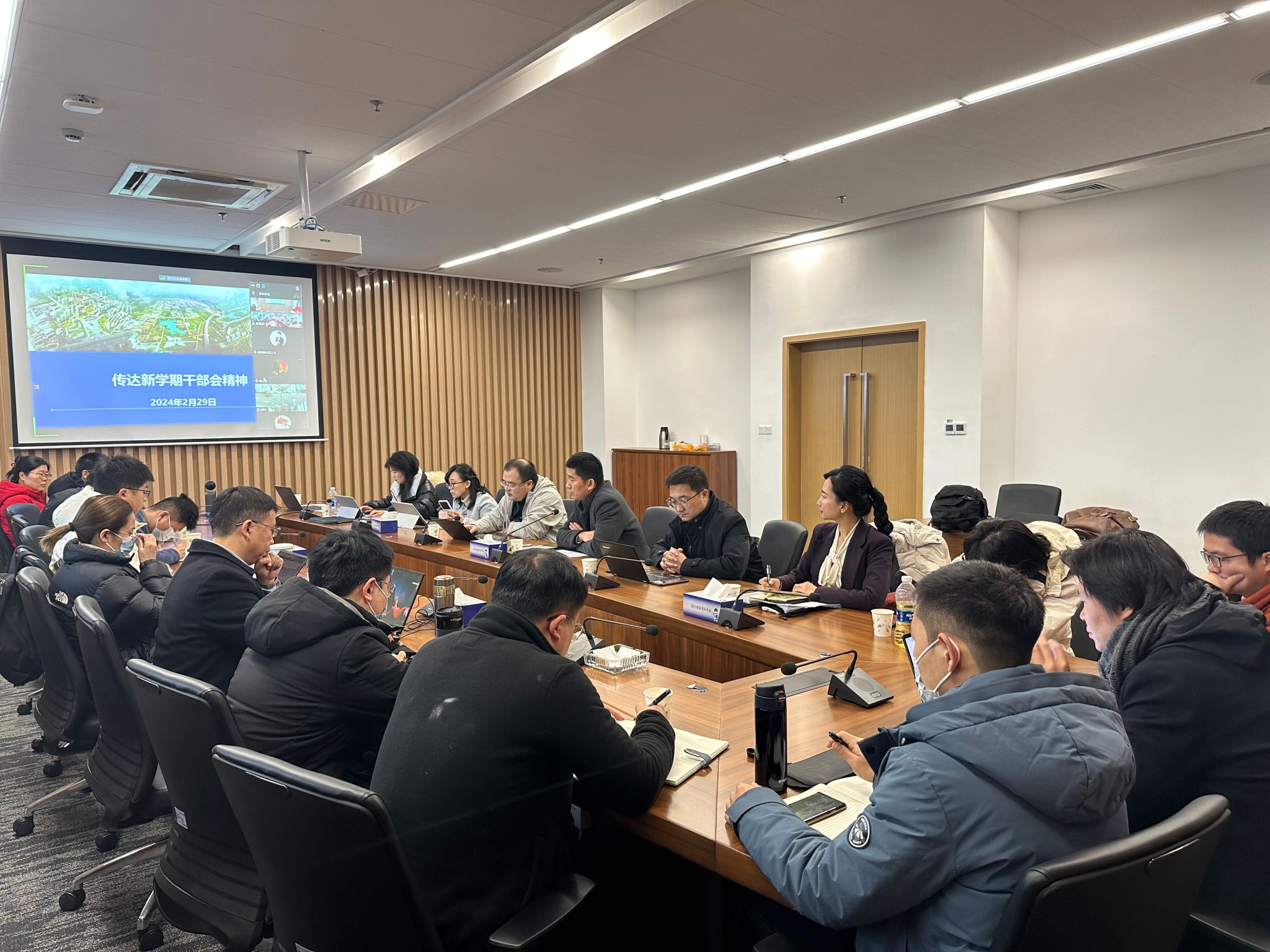 在太仓智汇港C座615会议室召开春季学期全体教职工大会,传达学习学校寒假务虚会、新学期中层干部会会议精神,研究落实学院聘期目标责任制和2024年总体工作计划。学院领导班子成员以及全体教职工参加会议,部分教师线上参会,会议由学院党委书记李晗主持。