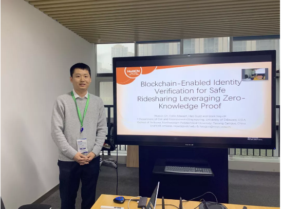 本次会议分为信息中心网络和区块链网络两个分会议,郭昊报告的论文题目为“Blockchain-enabled Identity Verification for Safe Ridesharing Leveraging Zero- Knowledge Proof”。论文针对共享出行中的数据隐私安全问题,提出了一种新的保护乘客隐私的身份验证系统,扩展了非互动性零知识证明和区块链在共享出行场景下的应用。