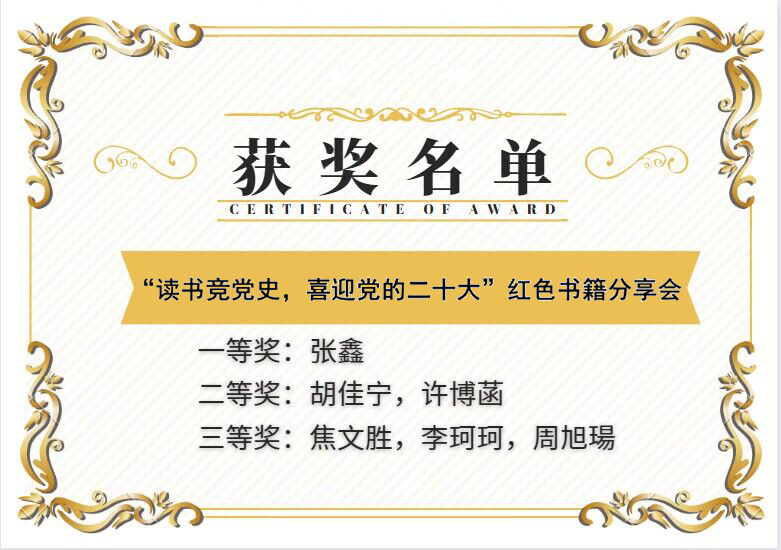 参赛选手按照抽签顺序,将一部部红色作品与党的二十大精神相结合,分享自己的心得感悟。张记国对每位同学的分享给予了专业细致的点评,评委们也对每位同学提出党史问题。激烈的竞答环节之后,根据评委打分评选,获奖名单如下图: