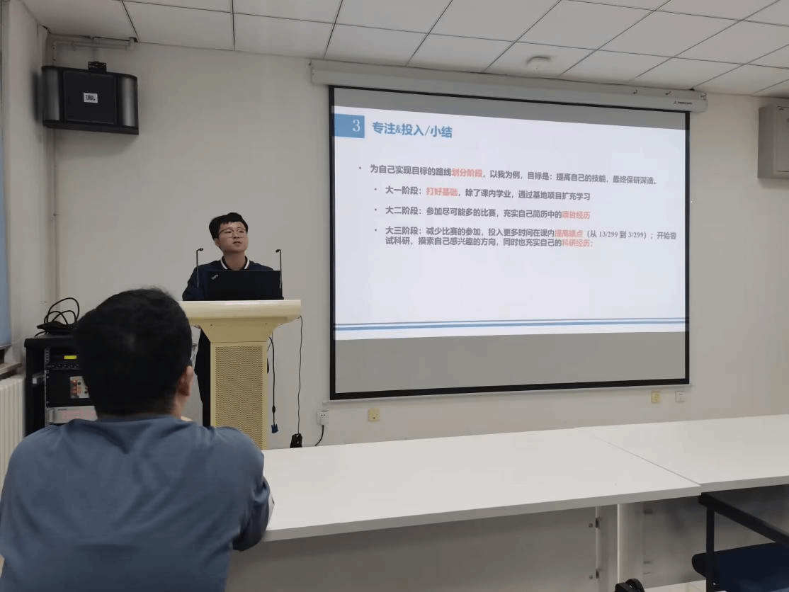 首先带来分享的是卢军汀同学。他从“获取信息”、“选择环境”和“专注&投入”三个主题出发,首先要先了解自己能干什么、需要干什么,才能决定想干什么给自己一个天马行空的开始;其次选择环境的重要性远大于适应环境,要选择好学习环境、人际圈、平台,例如:积极加入优秀的实验室团队或多去图书馆;然后要目标清晰,切分不同阶段,不同阶段有侧重点地投入,讲述了自身大一打基础、大二打比赛、大三主科研的经历;最后不要害怕尝试,找到自己热爱的点,多运动、多看书、多交朋友,这样才可以把握大学珍贵的时间,不负韶华,绽放自我。