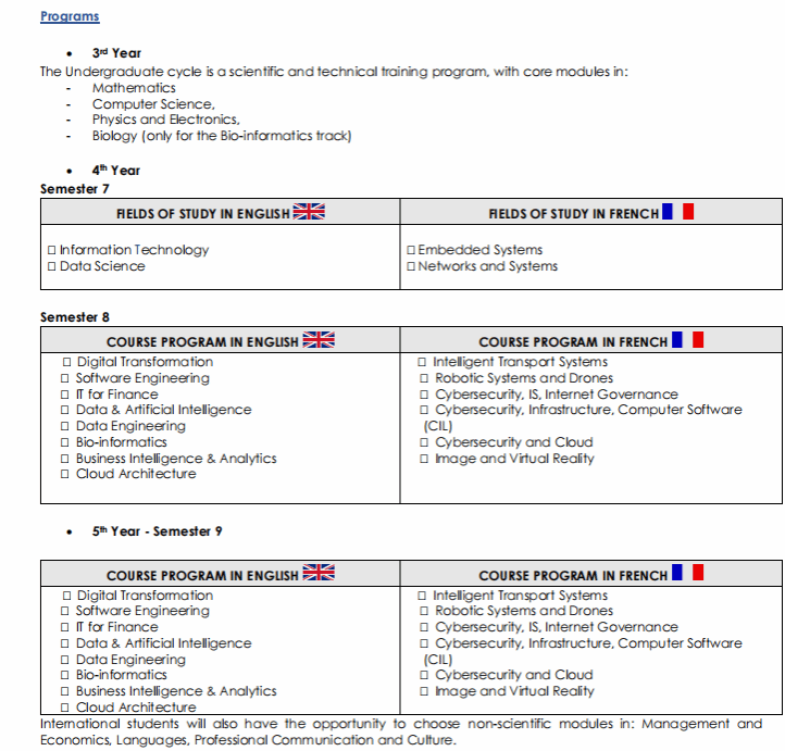 硕士工程师2年/3年 : 6个全英语授课课程 / 6个全法语授课课程